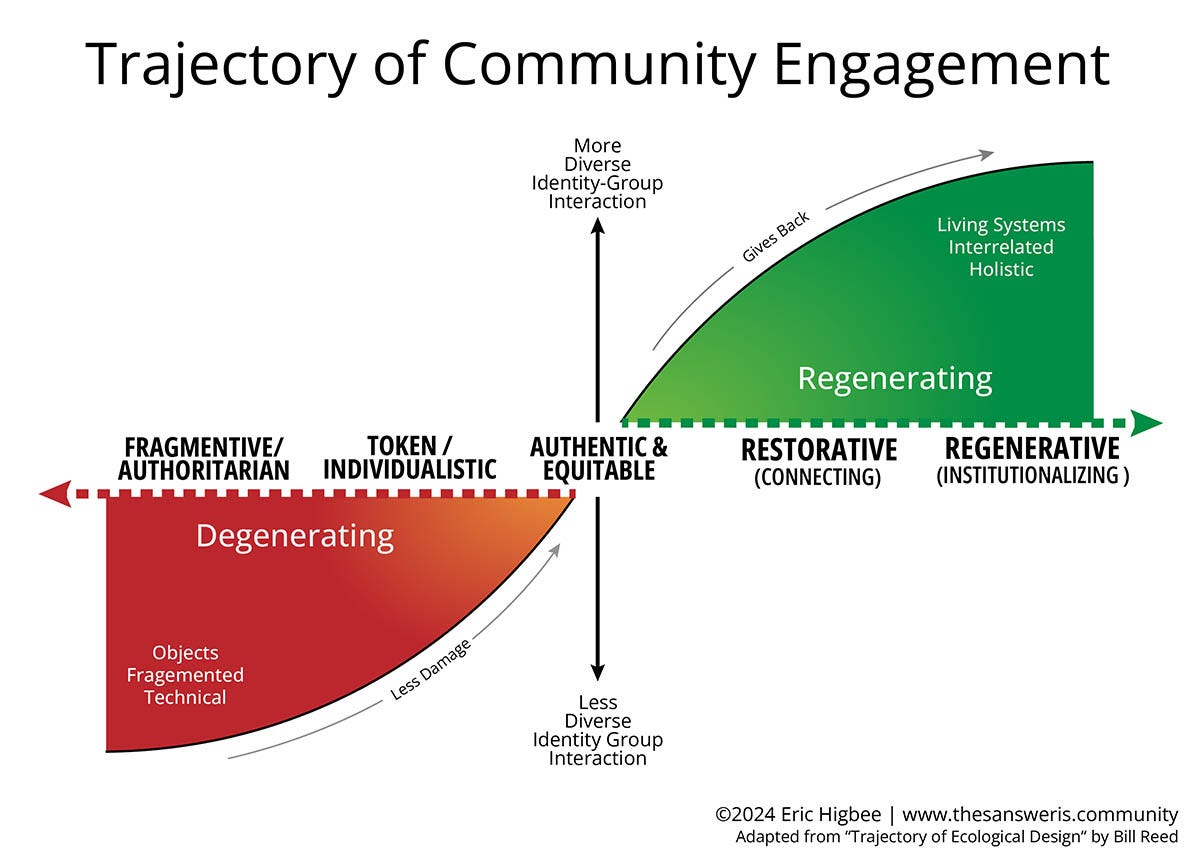 From what I’ve seen, most contemporary community engagement -- even that labeled authentic and equitable — is agnostic to such restorative and regenerative outcomes.