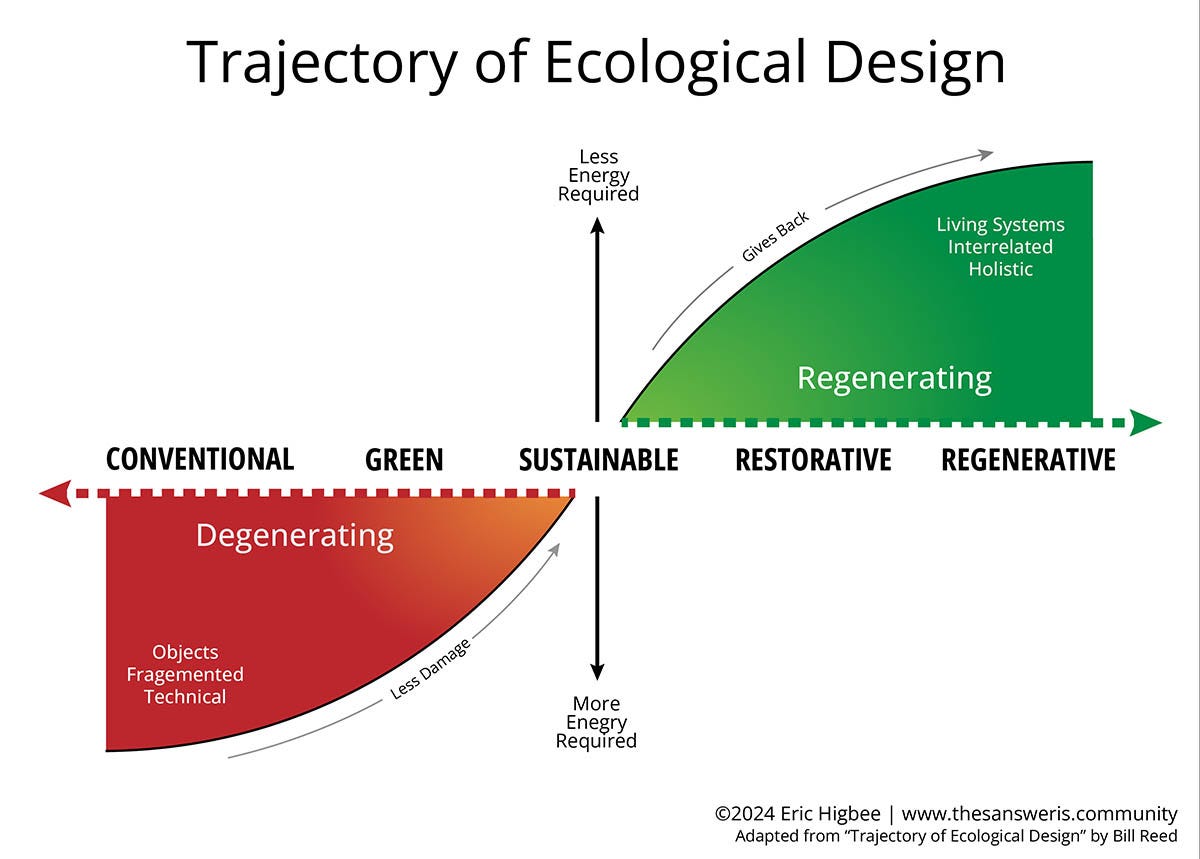 It’s like an architect who incorporates on-site salvaged building materials but doesn't also consider how to strengthen the health of its encompassing ecological systems. Sustainable? Sure. Regenerative? Not so much.