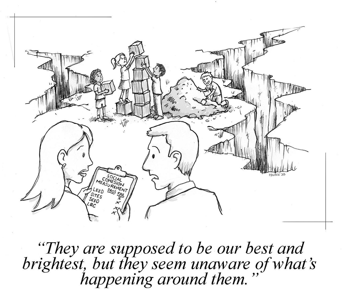 However, the requirements for this credit are minimal and vague. For example, “present the design to the public,” or “invite site users and stakeholders to the design development presentation.” That’s outreach, not engagement, and certainly not social cohesion.